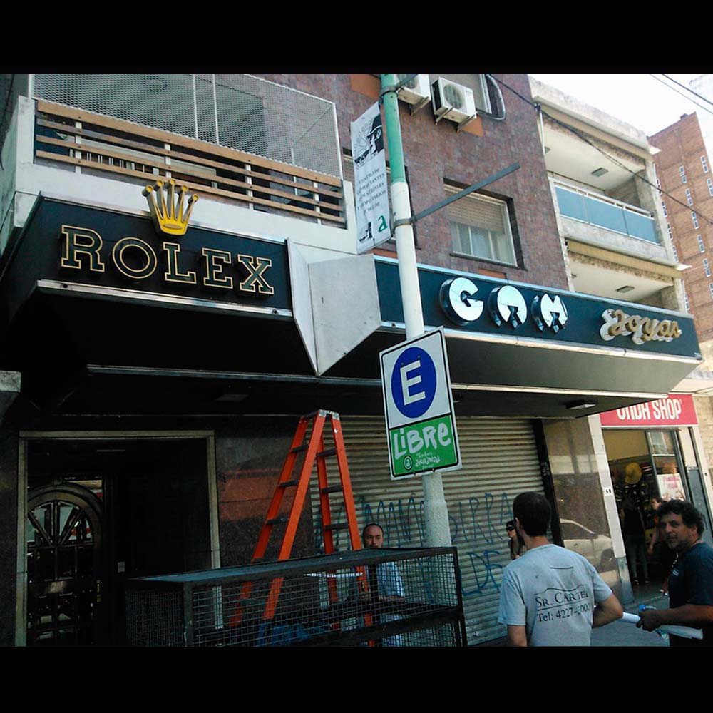 Cartel de aluminio compuesto con corpóreos de polyfan y marcas en corpóreo de chapa con frente de acrílico, iluminación LED.