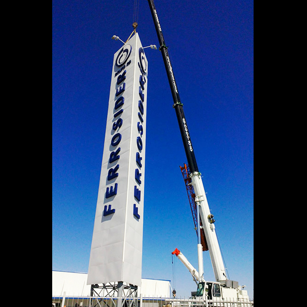 Estructura de ángulo reticulado forrado en chapa plegada, letras corpóreas de chapa. (26 mts de altura)