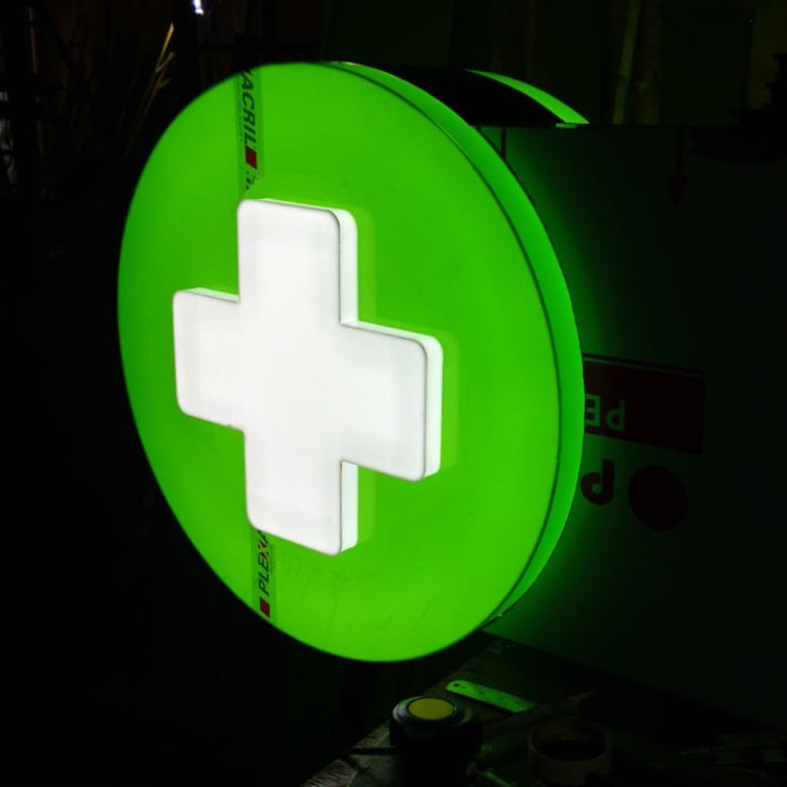 Totem de aluminio compuesto con corpóreos de acrílico.