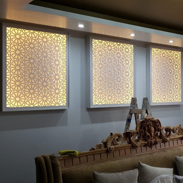 Paneles de MDF routeado con motivos abstractos geométricos.